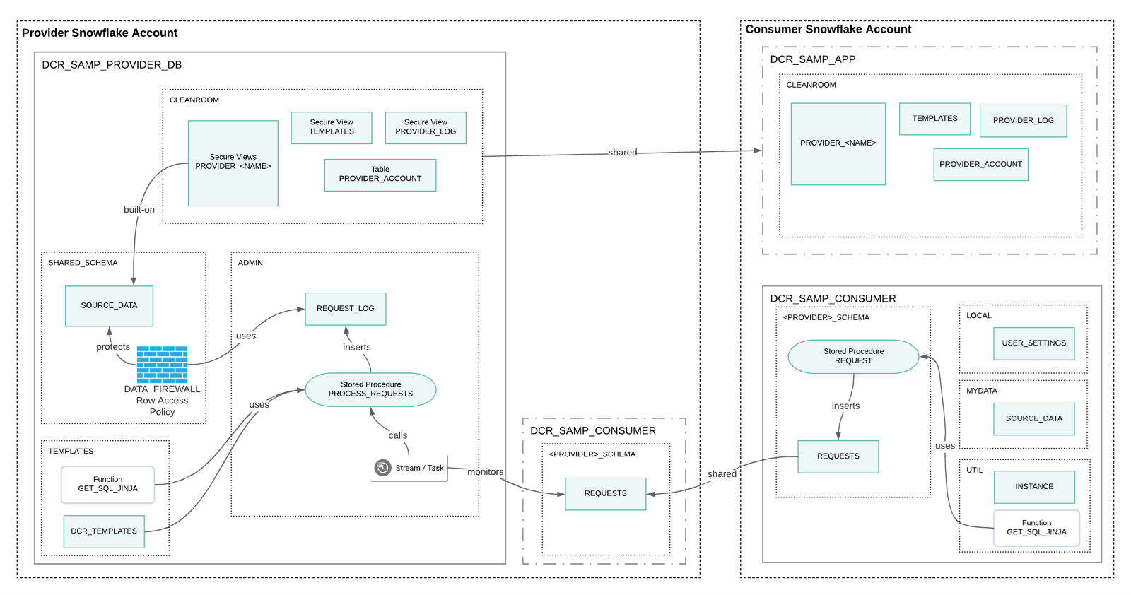 Check out this graphic to see the flow implemented using Snowflake's existing features, such as data sharing, stored procedures, Python User-Defined Functions (UDF), streams, tasks and row access policies. Configuration and usage are accomplished by executing the source code. This is a complex mechanism, but the critical point is that instead of sharing data directly, the consumer only has access to aggregate results through templated queries.